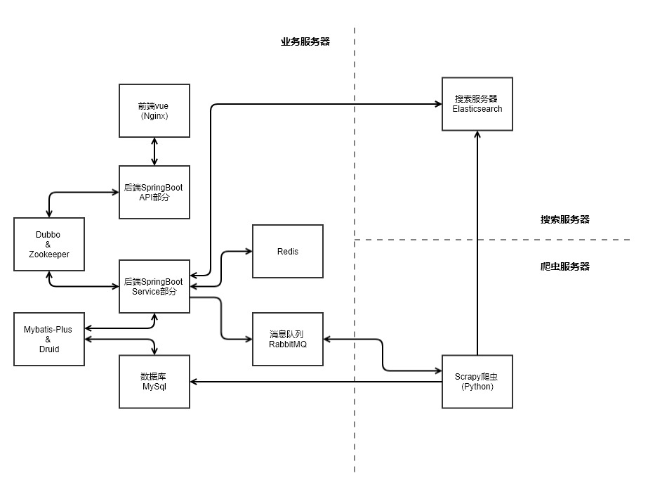 网站分为四个部分,三台服务器。其分别为后端数据获取部分,也就是上面的爬虫服务器 后端业务逻辑部分与前端展现部分, 也就是上面的业务服务器,搜索部分,也就是上面的搜索服务器。